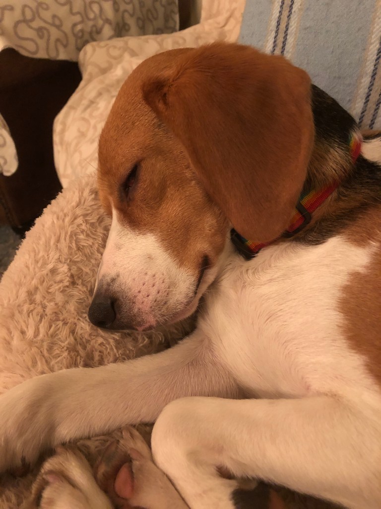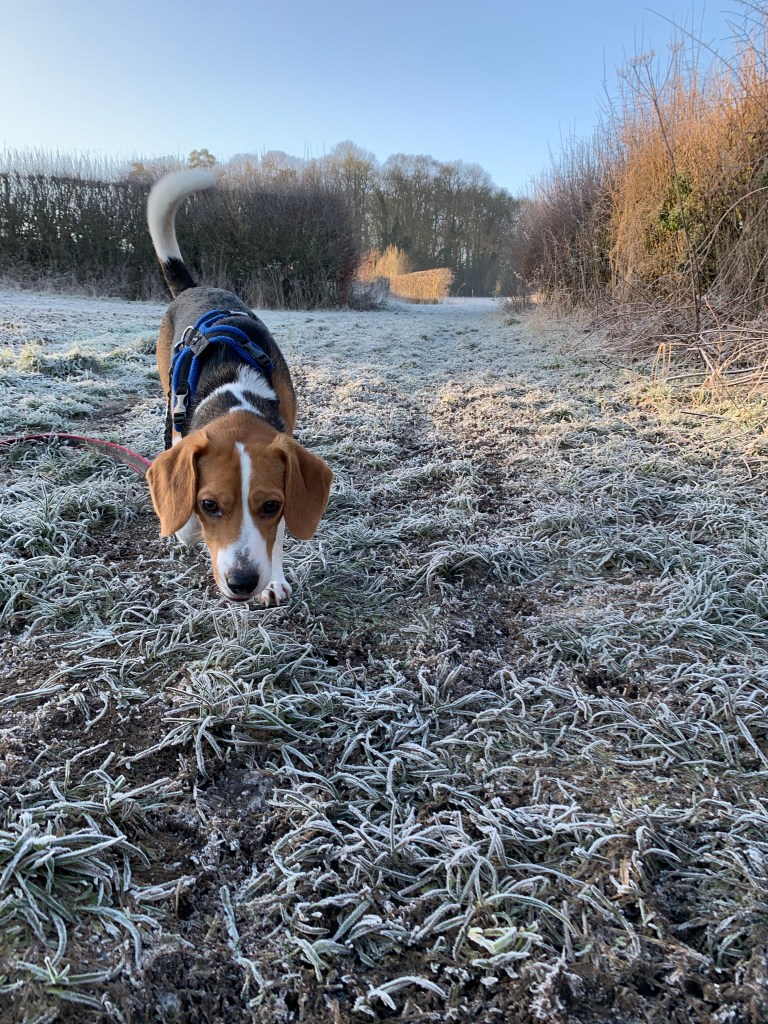 Then we are through the copse, still pulling left and right to try and make friends with the squirrels, rabbits and foxes who live there, and back down the hill towards home. For some reason they don’t seem as keen. At this point Lenny has learned that putting on the “beagle brakes” means our walk is extended time wise. I have taught him well, haven’t I?