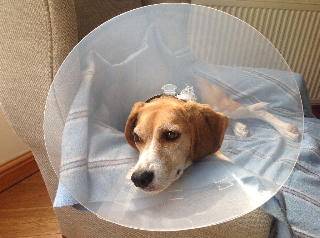 Mum and dad watched me for a couple of days as I was limping, sometimes quite a lot and often I couldn’t put my paw down, it was so painful. So a trip to the vets was arranged and the nice vet lady looked at my paw and said she thought I might have a grass seed in there. This made mum and dad look at each other with a bit of worry, as this can be quite bad and I may need an operation if it was true. I didn’t really understand what this ‘operation” meant, but I heard them all agree I would need to come back to the vets and fairly soon. So I went home and nothing really changed, apart from me having to wear a Cone of Shame to stop me nibbling at the paw and making it worse. I was given some antibiotics as they thought this might help draw the seed out of my paw. Strangely they couldn’t see the puncture where it had gone in. About a week passed, I went back to the vets and they still couldn’t find anything like a hole or wound in my paw, and then wondered if I have trodden on something that was caustic and burned my paw. In any case, it wasn’t getting better so it was decided that an operation would go ahead.