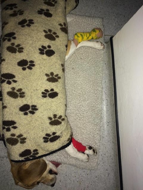 A couple of days later I was surprised when I wasn’t allowed to have any breakfast. My tummy was rumbling and I had been out for a walk, so this was different as I usually returned from my walk and ate my breakfast. We went to see the vet early in the morning and when mum and dad left me there I was quite sad. I didn’t know what was happening. However the nurses were very nice and I was being looked after and fussed over when all of a sudden I felt very sleepy. The next thing I knew, I was waking up under a big blanket, feeling a bit groggy, and with a huge bandage on my paw. Best of all, it had bones on it, but I knew that I couldn’t eat these bones as they were on the outside of my leg.