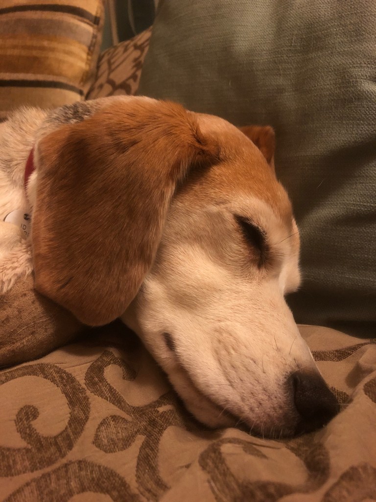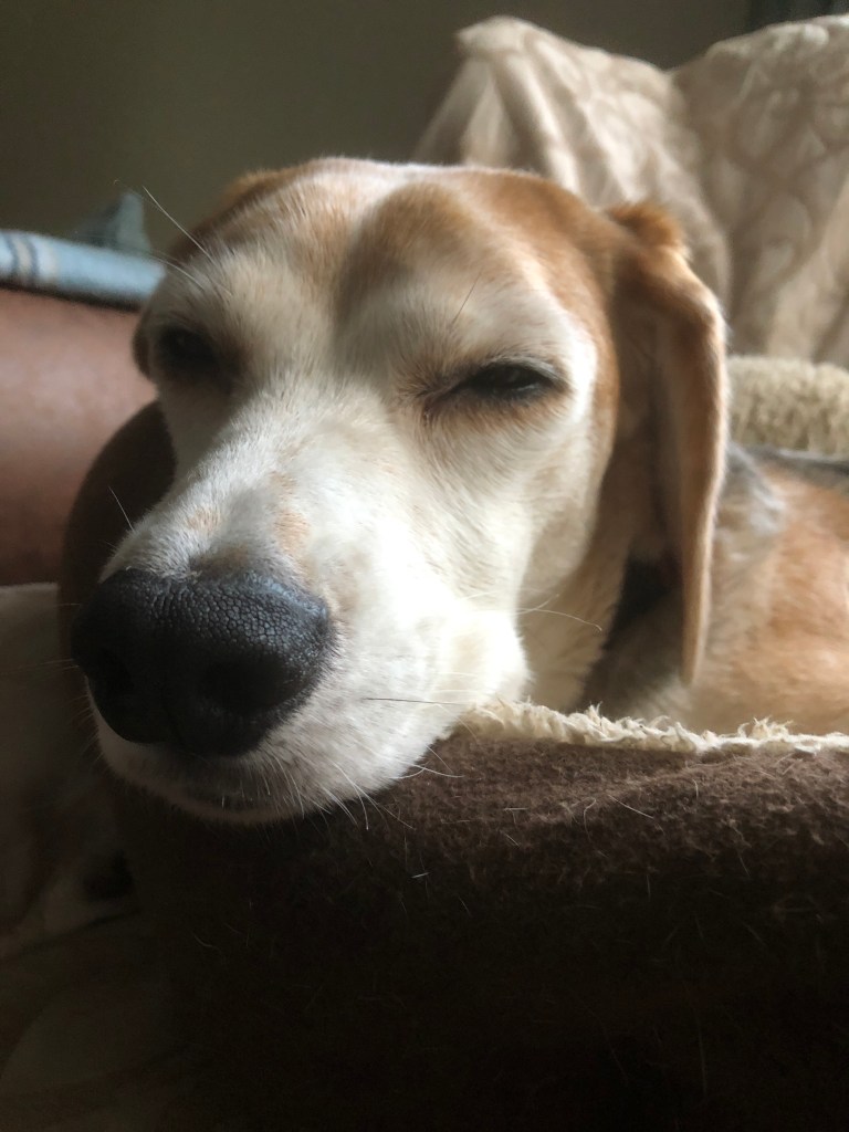 Anyway what I wanted to say is that, during my miasma of brain fog, I have been thinking about stuff and things. Lenny and I have also been talking about said stuff and things and we have decided that we are happy beagles. We are loved, looked after and we are safe and sound. There is an allegation that this picture proves how happy we are. I wouldn’t know, as I am asleep.