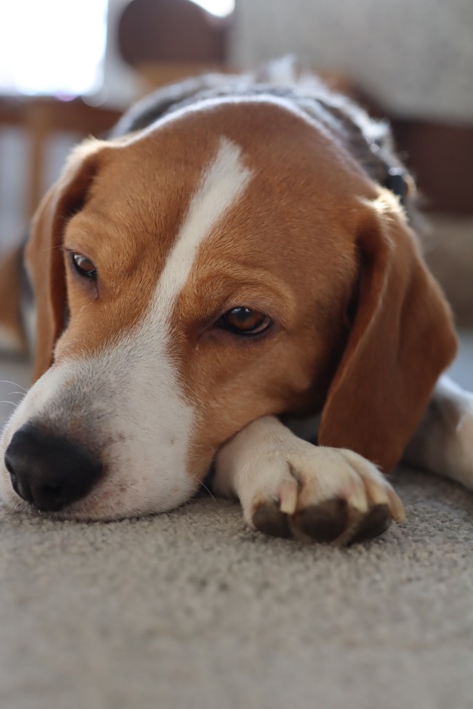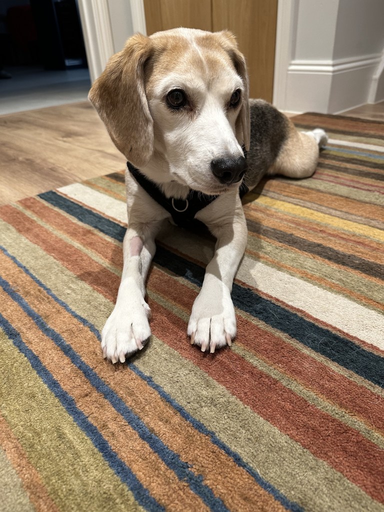 Two more vet visits and I am feeling much better. I get physio three or four times a day whilst Lenny gets training elsewhere in the house. The parents are still swapping over each night to sleep downstairs with me until I am given the all clear to resume the normality of being a beagle. I have another week at least of downstairs rest after which I will be assessed further. I seem to be making quick progress with standing on all legs, building up my leg muscles and being more mobile and comfortable walking about. The infernal Cone of Shame is still there, although I noticed over the last couple of days that it is being removed more frequently. I am not chewing or licking my leg as much as was feared so it is hoped that with the wound healing, the fur growing back and my general mobility getting better, I can be without the Cone for ever soon. I even managed some “helicopter tail” for one of my parents when he returned home a few days ago from running chores.