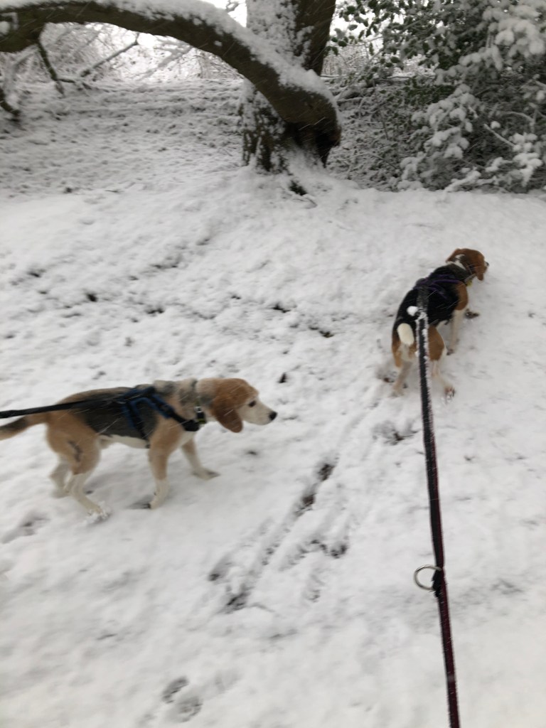 We were harnessed and then out of the door, turn left and down the hill, turn left down the lane and footpath and turn left at the school. Lenny was pulling and yanking on his lead, so much so that mum was having to rein him in as she slipped on the newly laid snow. It was then that I remembered that Lenny hadn’t seen snow before and, looking at the heaviness of the clouds, we were going to get a fair covering of it. Anyway onward and up the hill to the first field which was already filling up with snow. Let the shenanigans commence. We pulled and jerked our way around the field, got snow plough noses and then wandered through the deeper stuff until the bottom of our harnesses acted like snow shovels. Lenny was running around like a fur possessed. He had this silly grin on his face as he tried to run and then bounce through the snow. Along the edge of the next field, up the slope and then toward the big field at the top. I figured that the far end would be the deepest and I was proved right once more when we got there and even I was having to leap almost gazelle like to make sure I walked and landed in the deepest parts. Straight through the woods on the return journey and the trees were covered in their wintery coats. Still Lenny has this grin on his face that he was in his absolute element. I was also enjoying it so much that I had forgotten to introduce him to yellow snow. That I had been warned by my parents not to be so horrible to Lenny didn’t contribute to my forgetfulness at all.