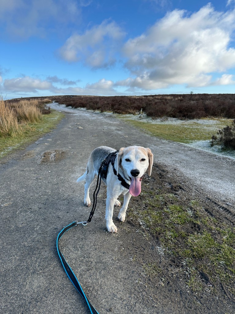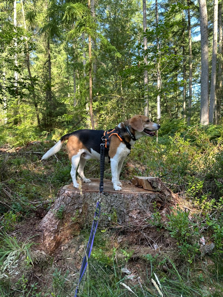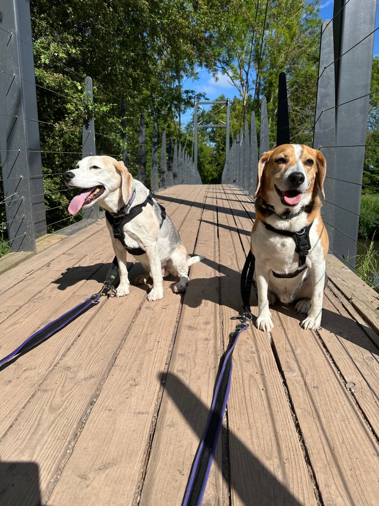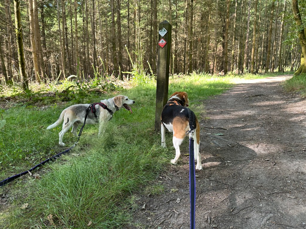 We set off at a pace along the first path, through the cool trees and trying to keep under the cover of the tree canopy. The sun was rising swiftly and we wanted to try and see as much as we could in the time available. Once we had walked briskly around a circuitous route, we found ourselves coming toward a fellow beagle called Chester who was thirteen, off lead and well behaved. What was this sorcery? I fear this is the end game for Lenny and his “training”.