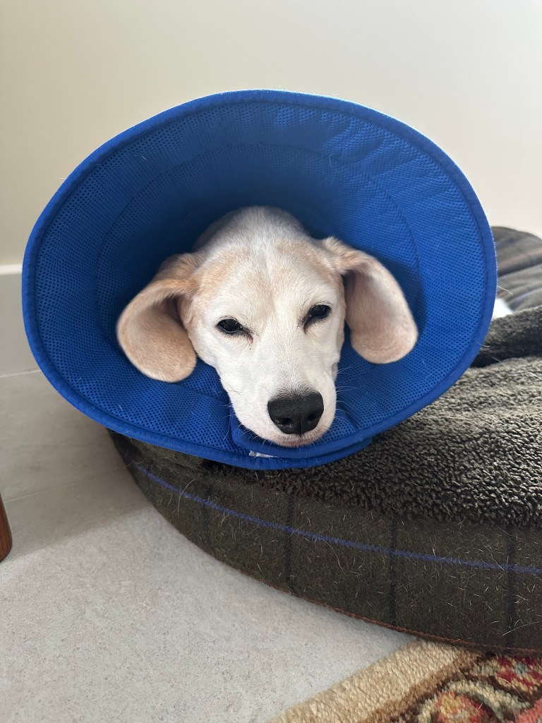 So there you have it. My freedom from the Cone of Shame was brief and I am now returned to its grasp around my neck. Cue comments such as “where is flowerpot head?” and “here comes the frilled lizard?”. When will this ignominy end? When will I be free from the clutches of the CoS. Is this destined to be my life from here on?