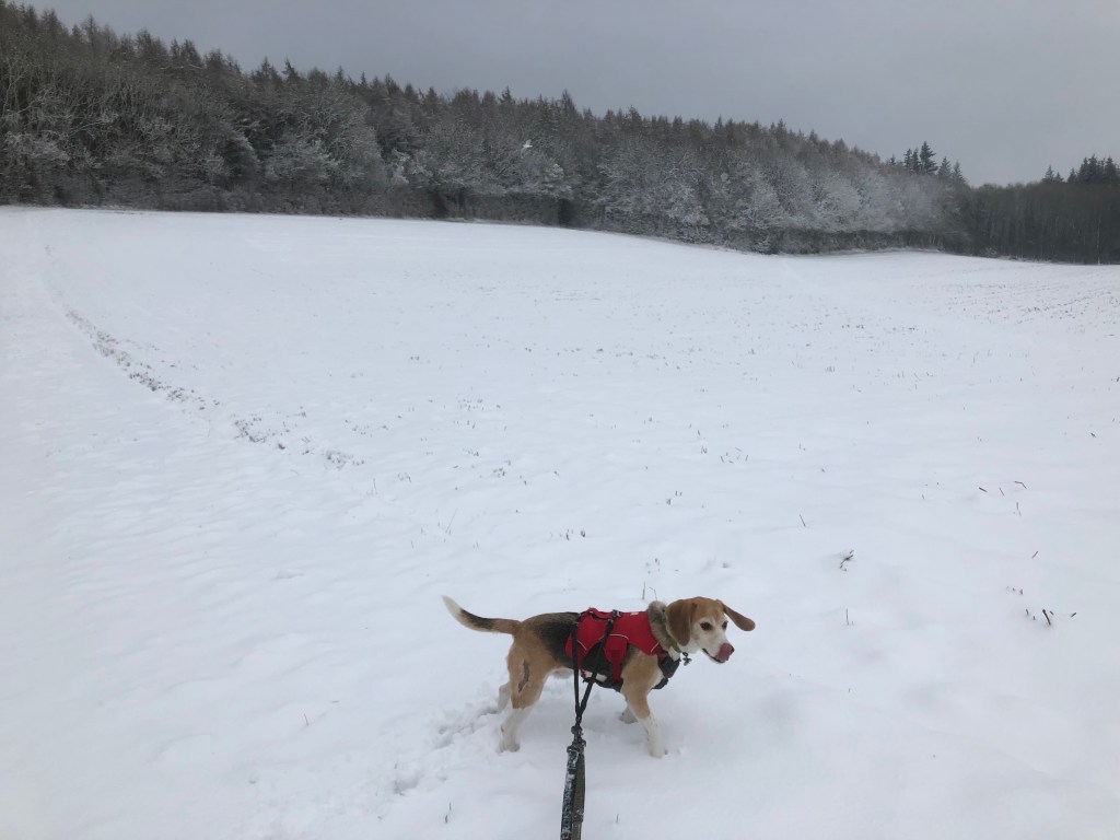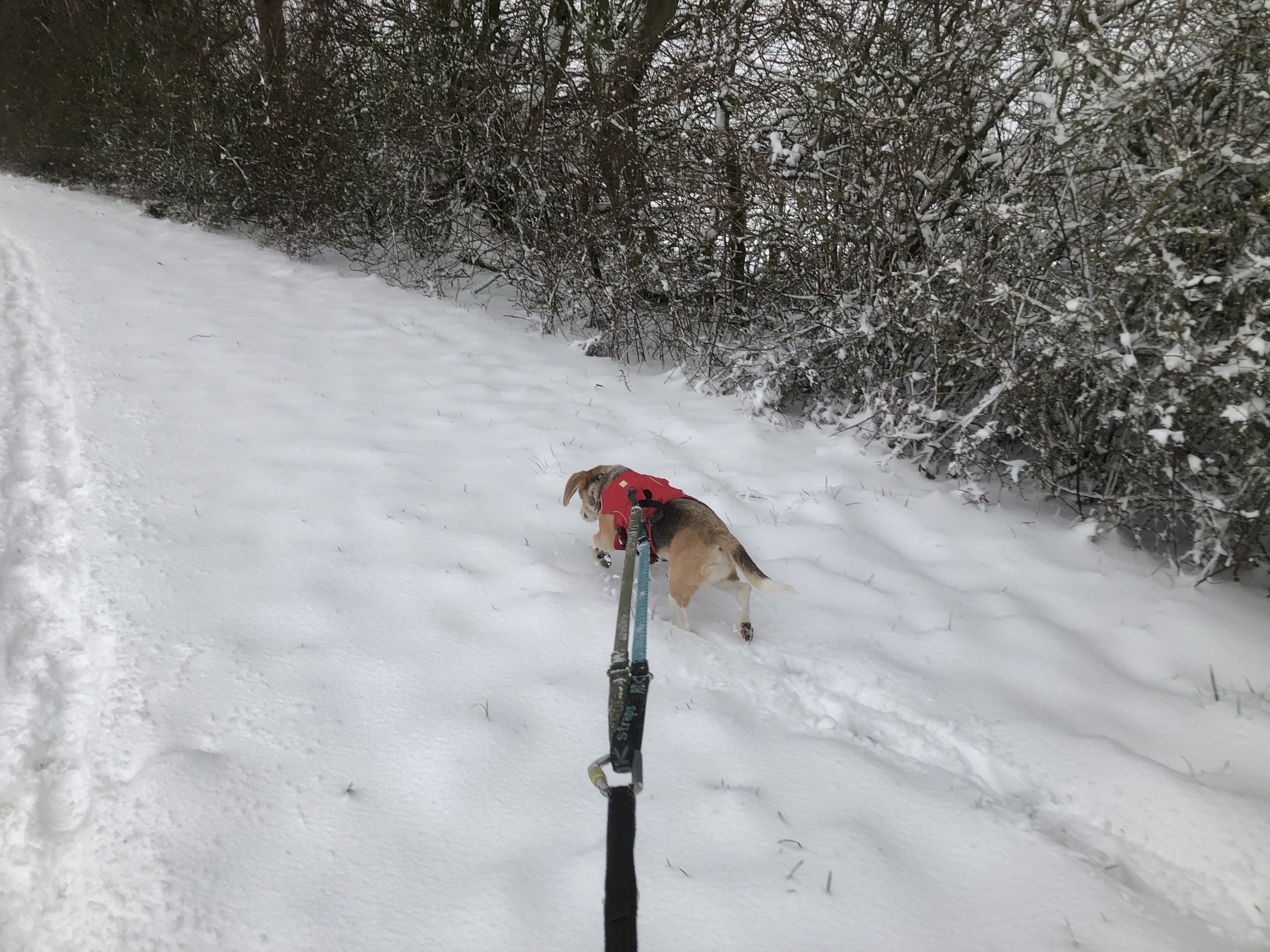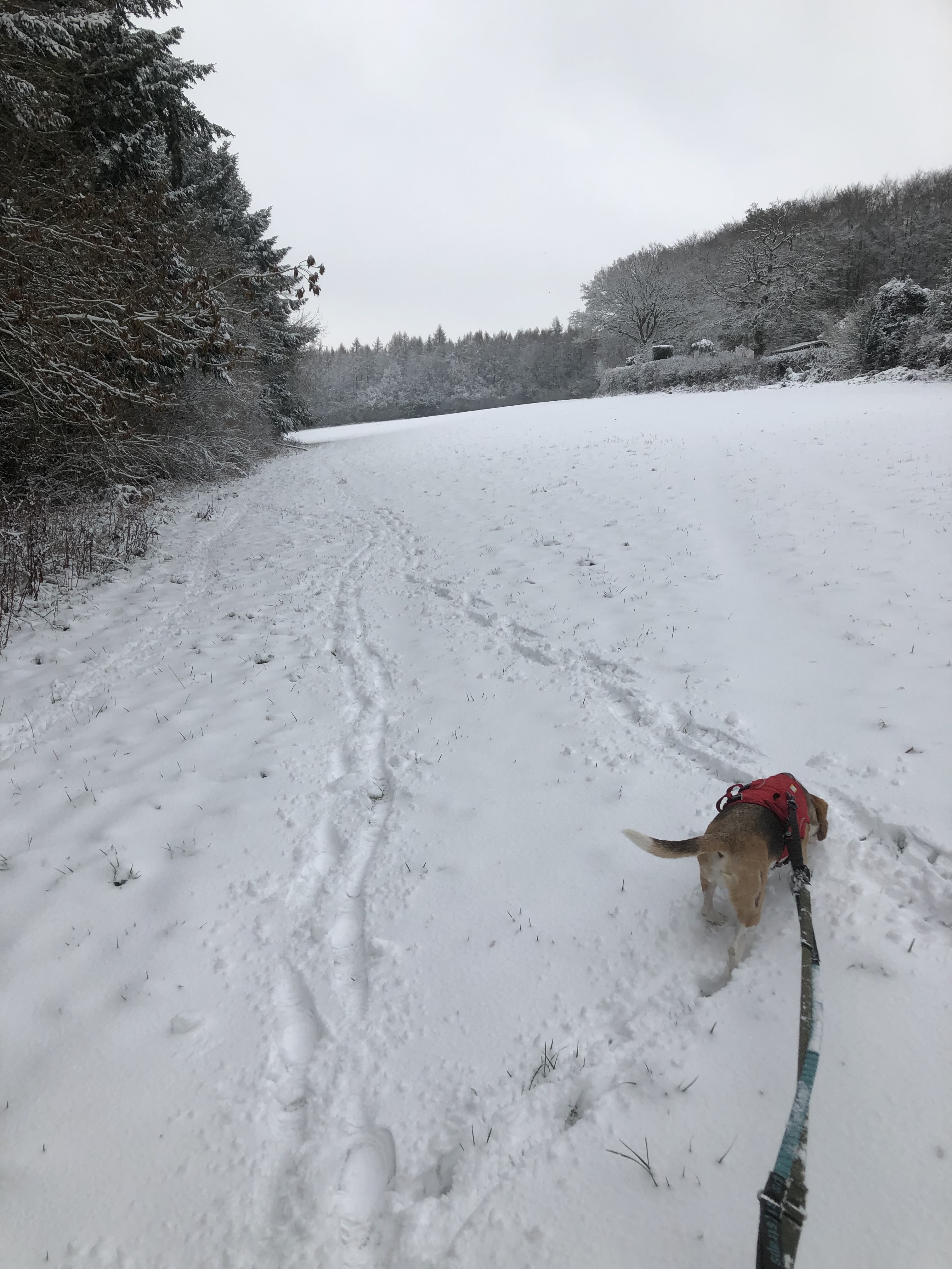 Up this field, turn right, down the steep bank, along the treeline and sense a deer or three in the woods. Sadly my human braking system decides we are not going into the woods just yet and we detour around the next field and into the biggest field on the walk. The wind is somewhat bracing and the snow is swirling around us. The scents seem to be sitting on top of the snow and my nose is like a beagle snowplough. What’s wrong with having a small pile of snow on the end of your nose?