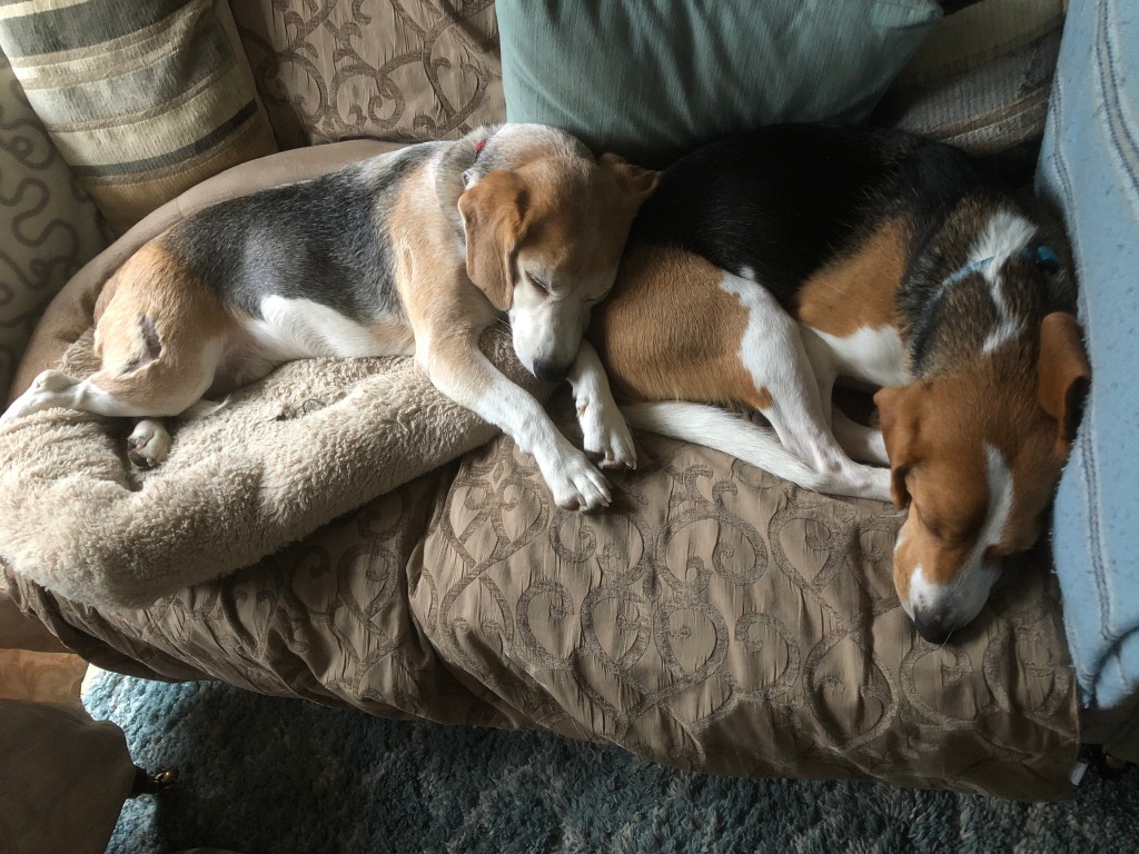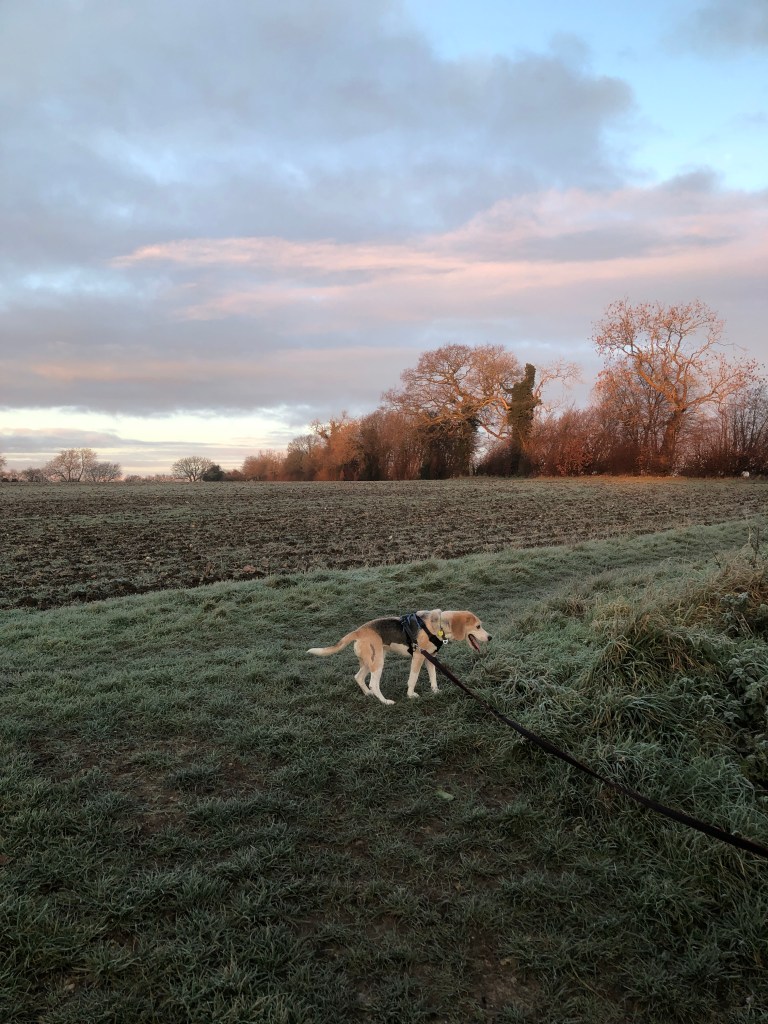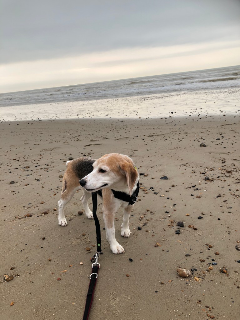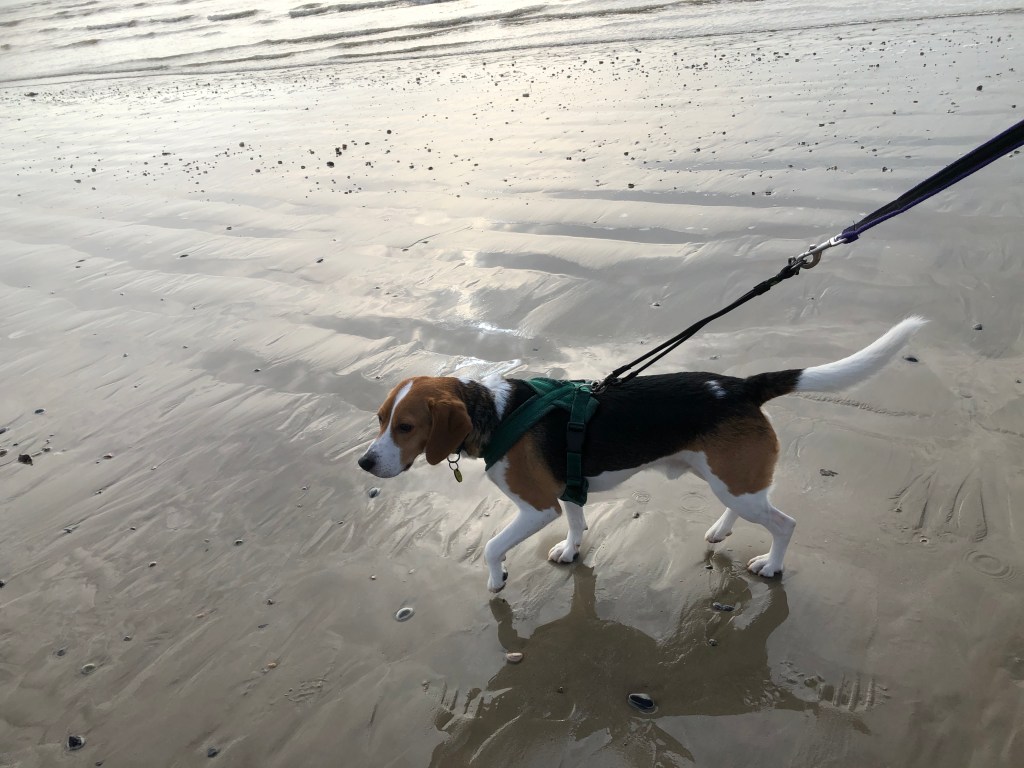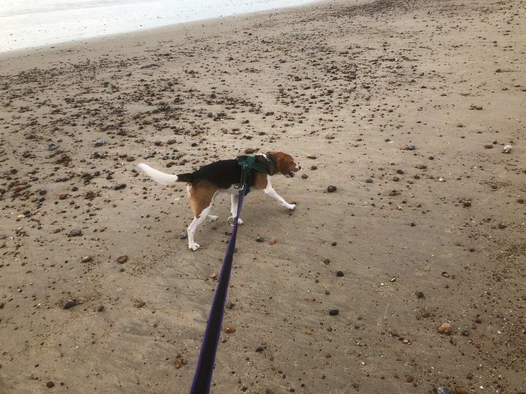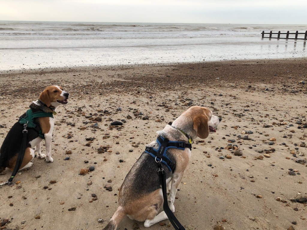 As we wandered along the top of the pebbles we saw the seawater tempting us away to our left. Mum and dad had little choice but to go to the edge of the water so Lenny and I could find dead crabs, seaweed and cuttlefish pieces washed up along the sand. This was fun, we walked along with grins on our faces and the wind in our ears. The scent was high and Lenny was taking it all into his scent factory. Behind us another beagle strolled past so we took the chance to bay. Loudly. Very loudly. So loudly in fact that people on the promenade heard us and started smiling. Further along the sand Lenny found a dead crab and picked it up. He suddenly realised that seawater tastes disgusting so dropped it immediately and went to grab some seaweed instead. He spat that out too. We strolled along, saying hello to people who all kept their distance from us, so keeping everyone safe whilst the quarantine is still in place. The another beagle came strolling toward us and we met him in customary fashion, proceeding to tangle our leads and try to play bitey face with him. Duly embarrassed at our uncouth behaviour, mum and dad continued to walk away whilst apologising to the other beagle owner. He just laughed. We walked all the way along the beach to a river which we couldn’t cross so we returned to the car, all the while running in circles, tangling our leads and generally making mum and dad laugh. When we got back to the car something strange happened. Dad told Lenny to “Hup” into the boot and he did so immediately. Lenny doesnt like travelling in the car as he still gets some travel sickness but he had just leapt in freely. My brother was so happy from his walk that he had apparently forgotten about his travel sickness. I followed him into my crate and we both laid down for the return home which was nearby. What a morning we both had.