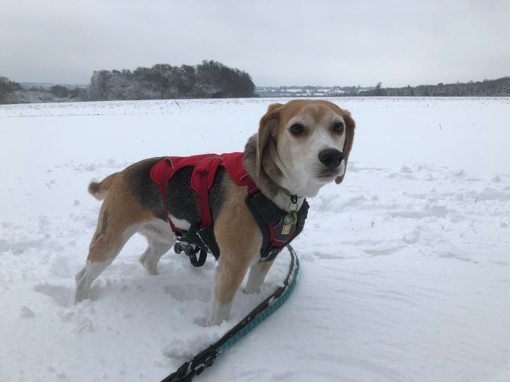 We made our way out of the house, walked slowly down the driveway in case it was slippery and then turned right into the field in from of the house. Lenny and I were quickly at the end of our respective leads, sniffing for treats hidden in the snow and trying to get as much snow on our noses as possible. We explored both sides of the path and then, once through the first gate, expected to continue our walk along the path. However we were gladdened to see that we were directed into the field to the left and alongside the river. Cue more pulling, huffing and puffing, along with associated shenanigans from the pair of us. Around the field, through the children’s playground and then back out into the field. We went through the deeper snow, around the bends of the river and then through the little line of trees back to where we had originally entered the field. It was here that Lenny and I stood quietly next to each other Lenny nose bumped me and we leapt, gazelle like, in opposite directions. We forgot that we are permanently harnessed to our staff so our bid to escape, and have fun, failed at the first hurdle.