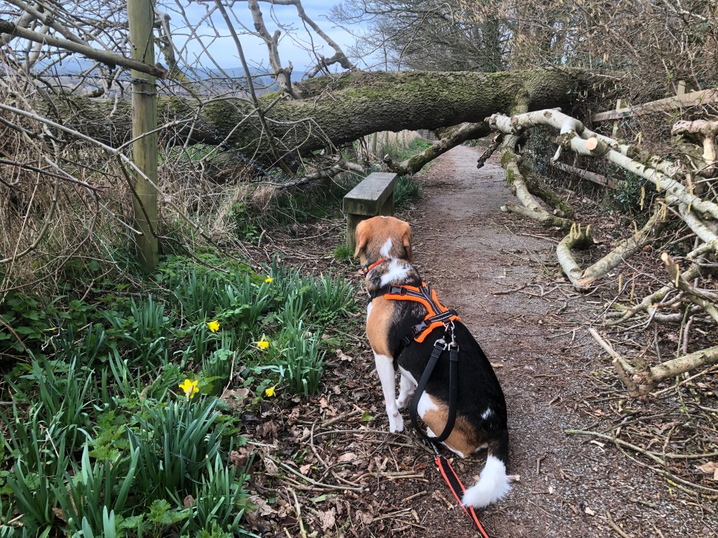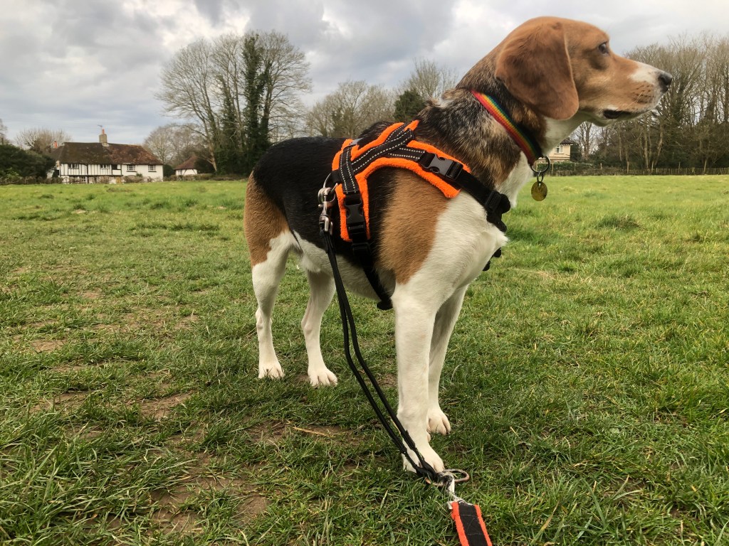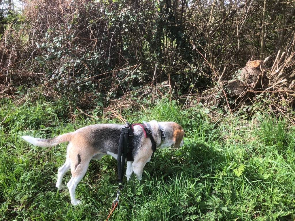 It was a bright and warm morning to explore the lanes to the west of the village. We set off at a quickened pace to ensure we didn’t miss any rabbits, squirrels or cats that may want to stroll across my path. We turned right at the end of the road, avoided being run over by the Sunday morning traffic and then right again onto the lane which took us to the edge of the village and beyond. We are lucky that there is a belt of greenery around the village and once past the houses, we can look across the fields toward the South Downs. Along the lane we marched, all the while with my nose no higher than 3 centimetres from the ground.
