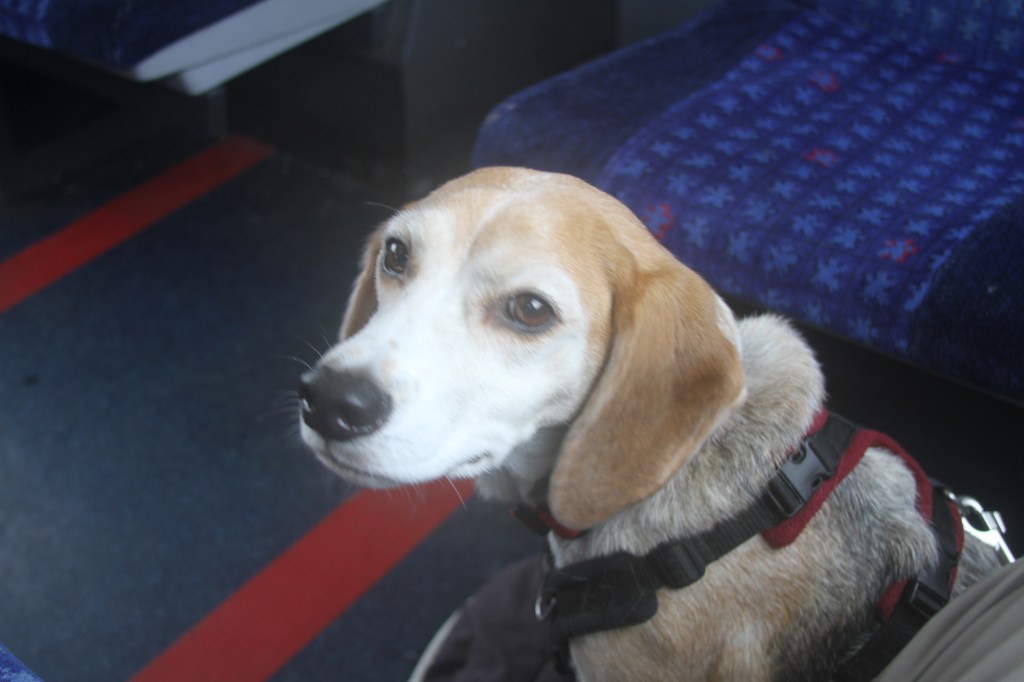 I found I was being hurried along through my walk, I then had my attendants watching me eat breakfast and finally found myself quickly returned to my harness. Off up the hill to the station and onto the train. We whizzed past fields, houses, sports stadiums and then into the tunnel before arriving at our first destination station. I stepped off the train and tried to breathe in the stale London air. Being moved along the platform at great pace, I wondered what was happening. It only got more intriguing when we left the station and I was allowed to walk through Regents Park so I could chase squirrels. At least that is what I thought I was doing there, but my parents had other ideas. Leaving the park and crossing the very busy road we descended into the bowels of the London Underground whereupon I was told in no uncertain terms to “Behave”. It was only appropriate for me to arooo and make everyone on the tube carriage smile. This was behaving, right?